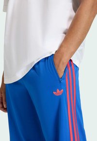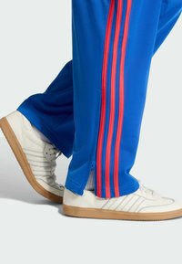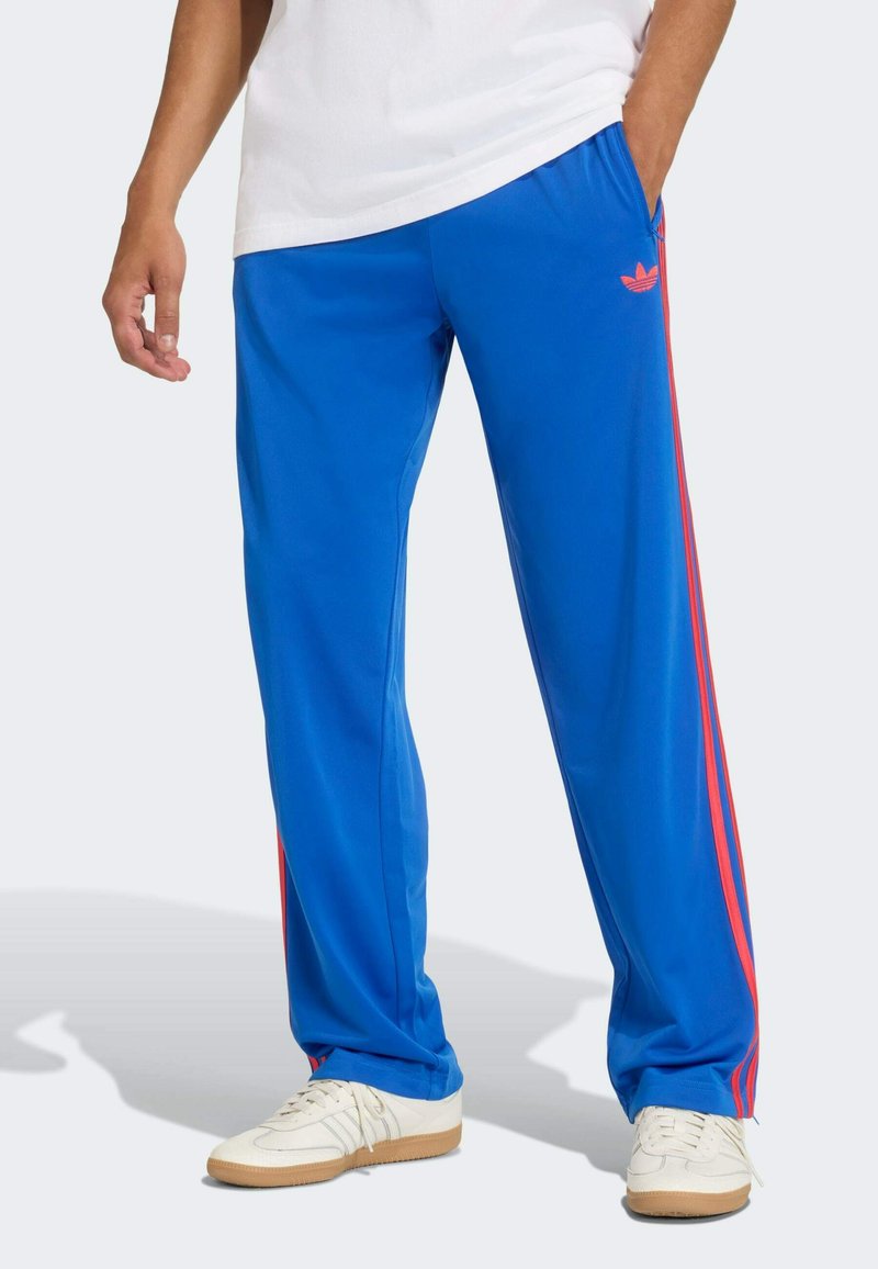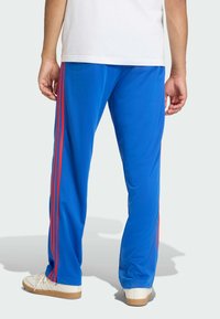 Modré sportovní kalhoty z hladké, lehké látky s červenými bočními pruhy a vyšívaným logem na levém stehně. Elastický pas.