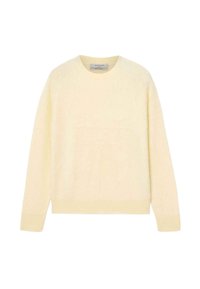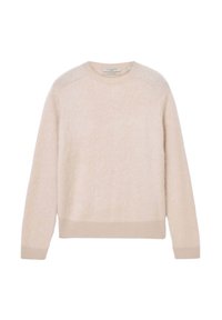 Světle béžový, měkký svetr s dlouhými rukávy a kulatým výstřihem, kombinovaný s bílými džíny. Látka působí načechraně a texturovaně.