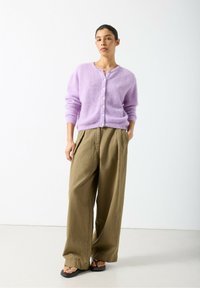 Lehký fialkový cardigan s kulatým výstřihem, knoflíky vpředu a žebrovanými manžetami, doplněný volnými khaki kalhotami. Jemná textura.