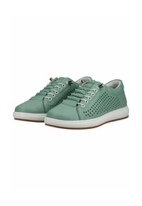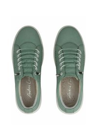 Nízká teniska z zelené kůže s bílou podrážkou, boční perforace ve tvaru trojúhelníků a zavazováním na tkaničky.