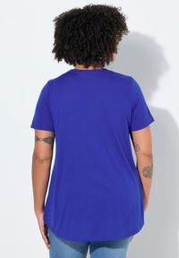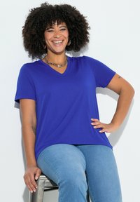 Tričko s krátkým rukávem a výstřihem do V v královské modři, vyrobené z měkkého materiálu. Má volný střih a končí těsně pod pasem.