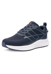 Námorně modré sportovní boty vyrobené z síťoviny a syntetických materiálů, s bílou gumovou podrážkou, texturovanými akcenty a kulatými tkaničkami.