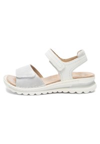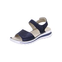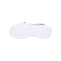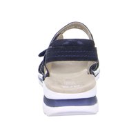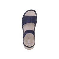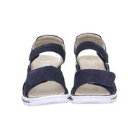 Námořnicky modrá sandála s otevřenou špičkou, nastavitelnými pásky, polstrovanou béžovou stélkou a bílou strukturovanou gumovou podrážkou.