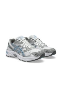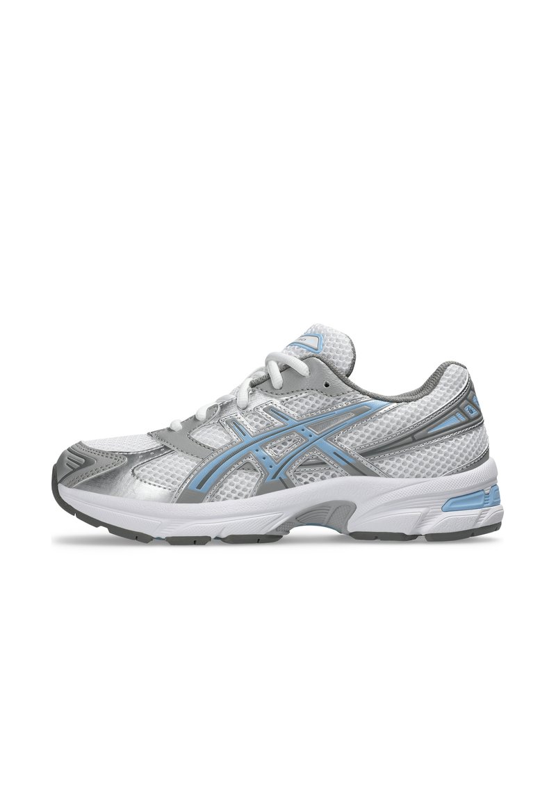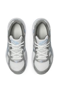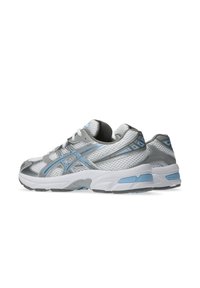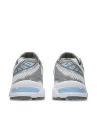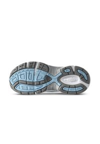 Sportovní boty s šedou a stříbrnou síťovinou na vrchu, modrými akcenty, bílou podrážkou a kulatými tkaničkami; mají polstrovaný límec a texturované detaily.