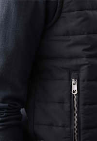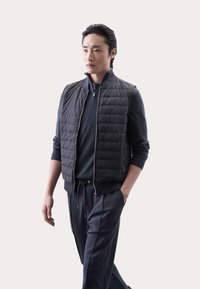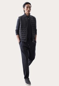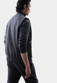Černá prošívaná vesta s vysokým límcem, zipovým uzávěrem a bočními kapsami, vrstvená přes tmavé dlouhé rukávy. Hladká textilie.