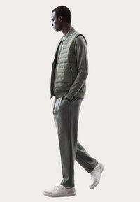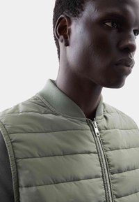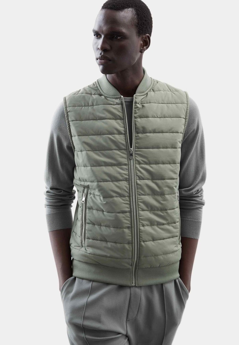 Vycpaná vesta v světle zelené barvě s horizontálním prošíváním, předním zipem a žebrovanými lemy; v kombinaci se šedou košilí s dlouhým rukávem.