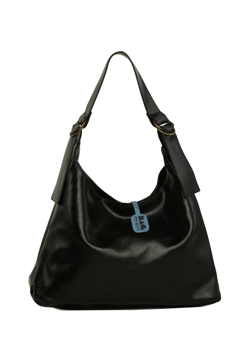 Černá kožená kabelka přes rameno se širokým popruhem, zlatými sponami a modrou značkovou visačkou visící z předního středu.