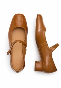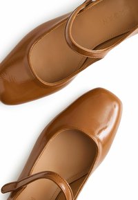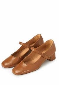 Hnědé nízké boty Mary Jane nošené s světle modrými ponožkami a dlouhou tmavě hnědou sukní stojící na světlé podlaze.