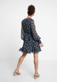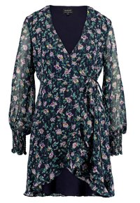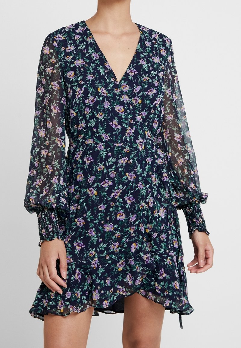 Květinové šaty v námořnické modři s fialovými a žlutými vzory. Mají dlouhé, průsvitné rukávy a volánkový lem, což nabízí lehký a splývavý design.