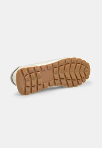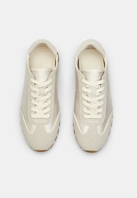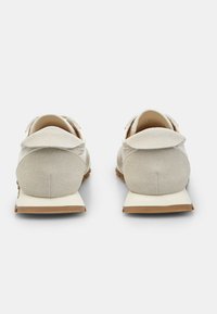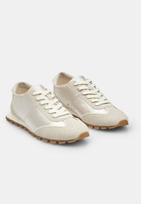 Béžová semišová a saténová teniska s zaoblenou špičkou, šněrováním a texturovanou gumovou podrážkou. Vyznačuje se jemným leskem a akcenty z různých materiálů.