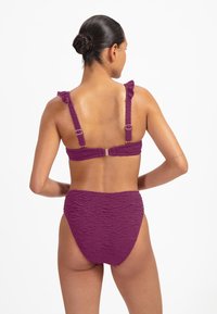 Žena má na sobě fialové bikini kalhotky s vysokým pasem a texturou, stojí s rukama za zády na bílém pozadí.