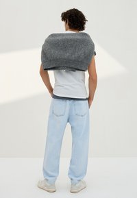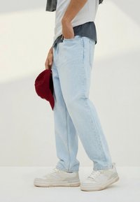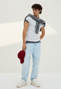 Osoba oblečená v světle modrých džínách a bílých teniskách, držící v levé ruce červenou baseballovou čepici, stojící před jednobarevným pozadím.