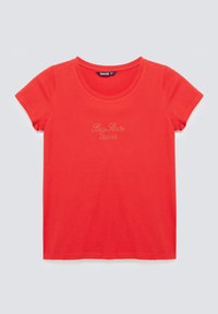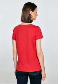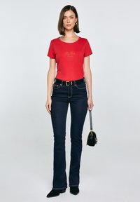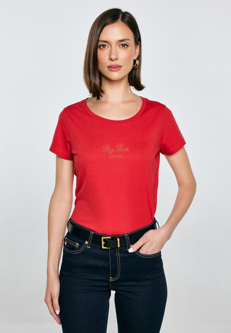 Žena s rovnými hnědými vlasy, oblečená v červeném tričku s krátkým rukávem a tmavě modrých džínách s černým páskem, stojící na jednobarevném pozadí.