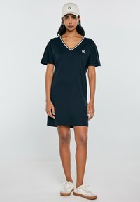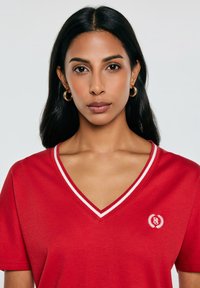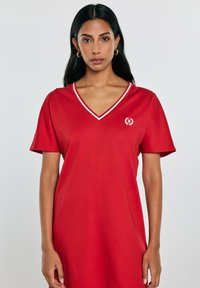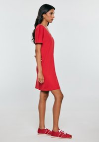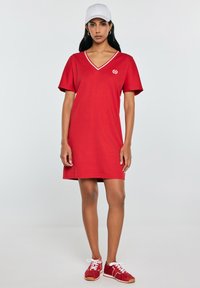 Žena v červených šatech s výstřihem do V a krátkými rukávy, bílou baseballovou čepicí a červenými teniskami stojící před jednoduchým pozadím.