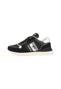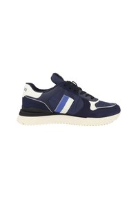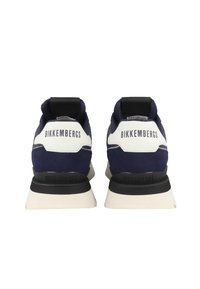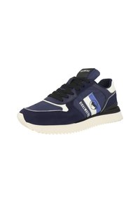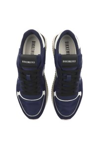 Námořnicky modrá teniska s bílou podrážkou, černými tkaničkami a logem Bikkembergs na boku v modro-bílém štítku.