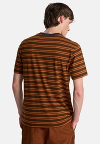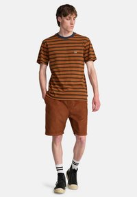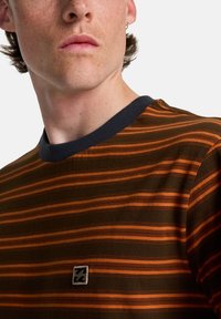 Mladý muž s krátkými hnědými vlasy, oblečený v hnědém a oranžovém pruhovaném tričku a hnědých kalhotách, dívající se dolů nalevo.