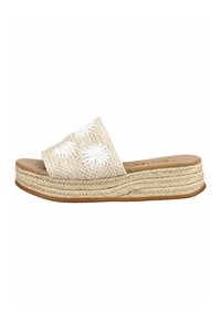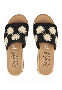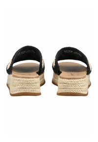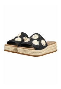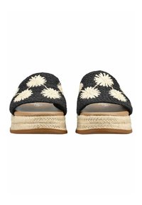 Černá tkaná nazouvací sandála s béžovou květinovou výšivkou a spletenou platformovou podrážkou v přírodních tónech.