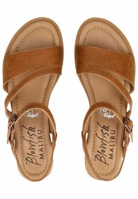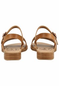 Plochá kožená sandála medové barvy se dvěma předními pásky, zápěstním páskem s přezkou a vrstveným nízkým podpatkem na bílém pozadí.
