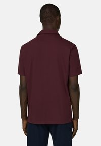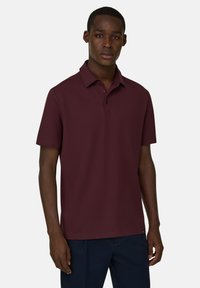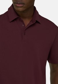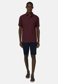 Muž oblečený do tmavě červené polokošile s krátkými rukávy a tmavě modrých kalhot, stojící před jednobarevným světlým pozadím.