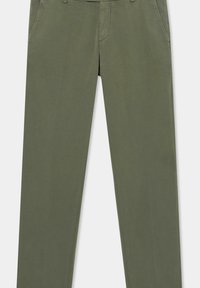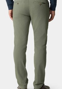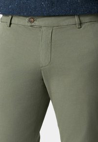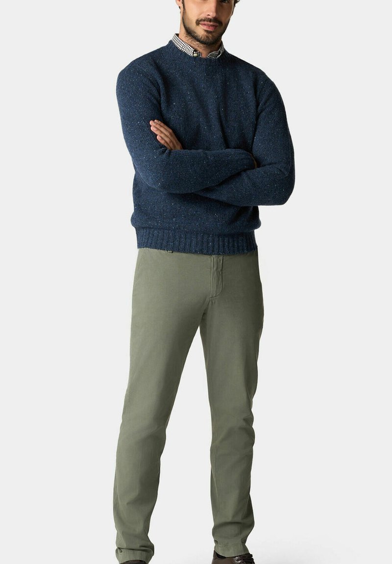 Námořnický texturovaný svetr s žebrovaným výstřihem, doplněný o světle olivově zelené chinos kalhoty. Model stojí uvolněně s překříženýma rukama.