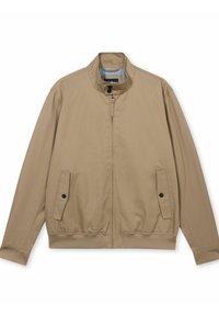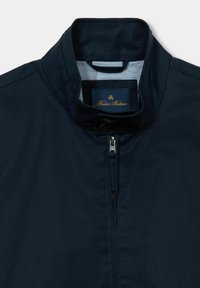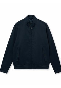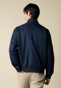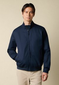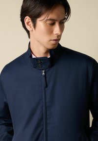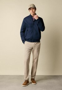 Mladý muž v tmavě modré bundě na zip s vysokým límcem a béžových kalhotách stojící před jednobarevným béžovým pozadím.