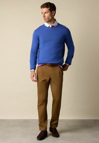 Muž v hnědých volnočasových kalhotách, hnědých semišových teniskách a modrém svetr s dlouhým rukávem, s rukama v kapse, stojící na jednobarevném pozadí.