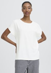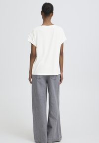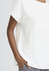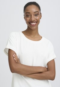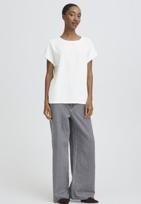 Žena s tmavou pokožkou, oblečená v bílém tričku s krátkým rukávem a šedých kalhotách, stojící se založenýma rukama v bok na jednoduchém světlém pozadí.