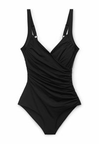 Žena s kudrnatými vlasy, která má na sobě jednocípy olivově zelený plavky s řasenými boky a širokými ramínky, stojící před jednoduchým světlým pozadím.