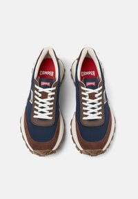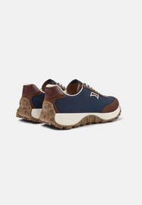 Nízkoprofilová teniska s tmavě modrou textilií, hnědými semišovými detaily, bílými tkaničkami, gumovou podrážkou a hnědým vzorkem, boční pohled na bílém pozadí.