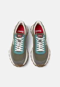 Zelená textilní teniska se šedými semišovými doplňky, bílou mezipodešví a hnědou gumovou podrážkou. Má tyrkysové tkaničky a boční logo.