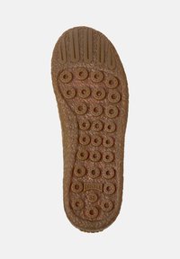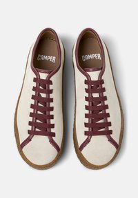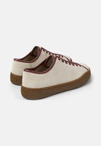 Béžová semišová teniska s vínovými akcenty, zavazováním na tkaničky, zaoblenou špičkou a texturovanou hnědou gumovou podrážkou. Minimalistický, nízký profil siluety.