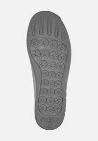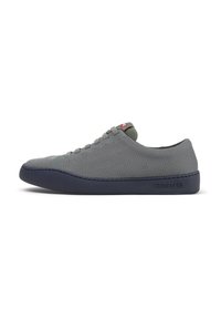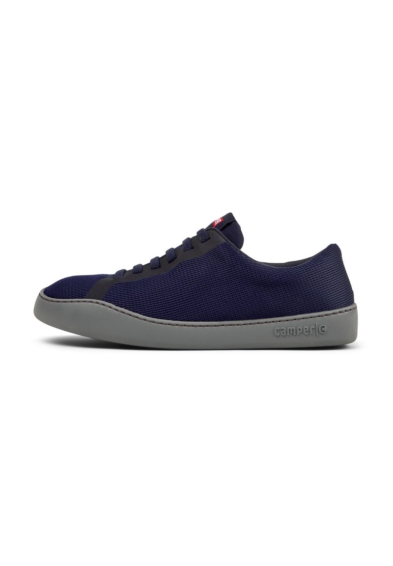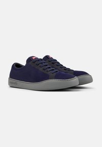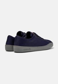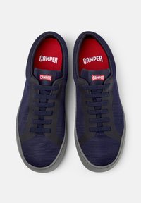 Tmavě modrá nízká teniska s texturovaným látkovým svrškem, černými očky na tkaničky a šedou podrážkou s raženým nápisem "camper" na bílém pozadí.