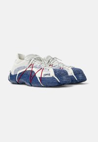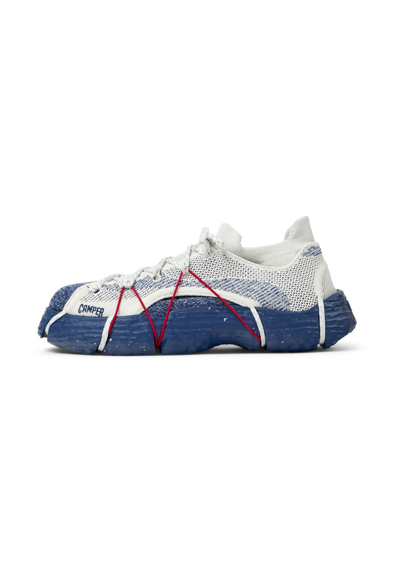 Nízký tenisk s bílou a modrou pletenou textilií, tlustou modrou podrážkou, červenými tkaničkami překříženými přes střed podrážky a nápisem "Camper" blízko špičky.