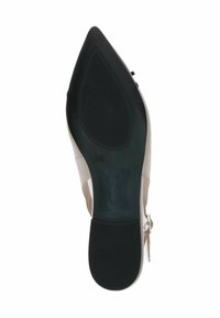 Béžová plochá obuv s otevřenou patou, špičatou černou lakovanou špičkou, malým detailem mašle a nastavitelným kotníkovým páskem se sponou.