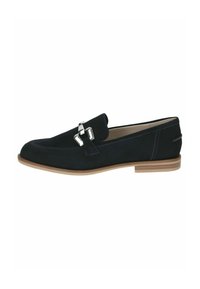 Béžové semišové mokasíny se stříbrnými lesklými kovovými ozdobami, zaoblenou špičkou a nízkým blokovým podpatkem. Hladká textura a minimalistický design.