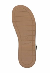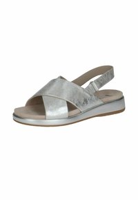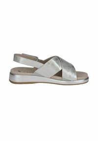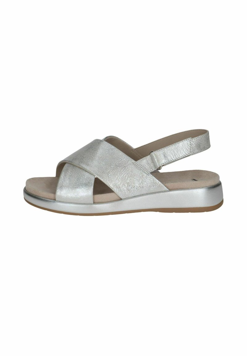 Stříbrná metalická sandála s křížovými pásky a zadní přezkou. Měkká podešev s mírným podpatkem, s béžovou stélkou a gumovou podrážkou.