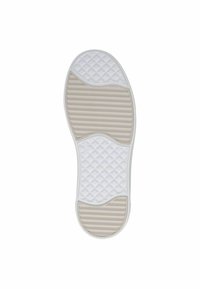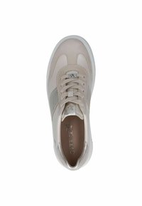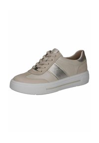 Béžová teniska s texturovaným koženým svrškem, metalickými detaily a bílou gumovou podrážkou. Má šněrování a dvě boční pruhy.