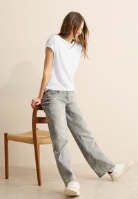 Usmívající se žena s dlouhými vlasy nosí bílý krátký rukáv s postranním zavazováním, šedé džíny, stojící s jednou rukou v kapse na béžovém pozadí.