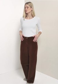 Osoba nosící hnědé kalhoty rovného střihu se zapínáním na knoflík, bílý top s dlouhým rukávem a bílé tenisky se zelenými akcenty.