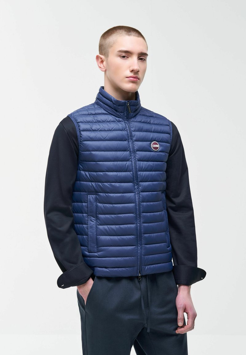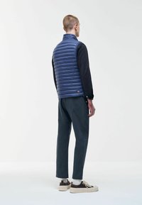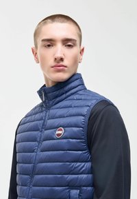 Mladý muž v modré prošívané vesta bez rukávů přes černé tričko s dlouhým rukávem, s rukama v kapsách tmavých kalhot na jednobarevném pozadí.