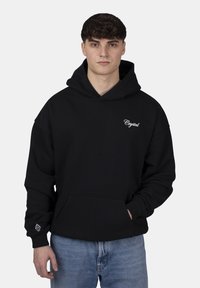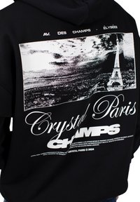 Černá mikina s kapucí s grafickým potiskem Eiffelovy věže v bílé a šedé barvě, s texty "Crystal Paris" a "CHAMPS" pod ním.
