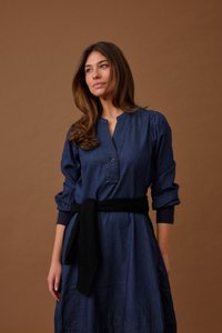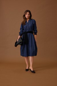Žena si upravuje černý pás na dlouhých rukávech námořnicky modrých šatech, stojící před jednobarevným hnědým pozadím, dívající se mírně vzhůru a stranou.