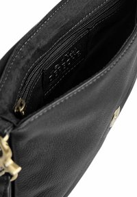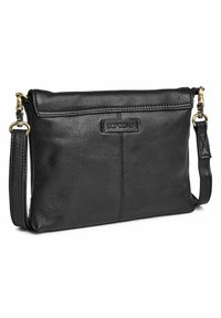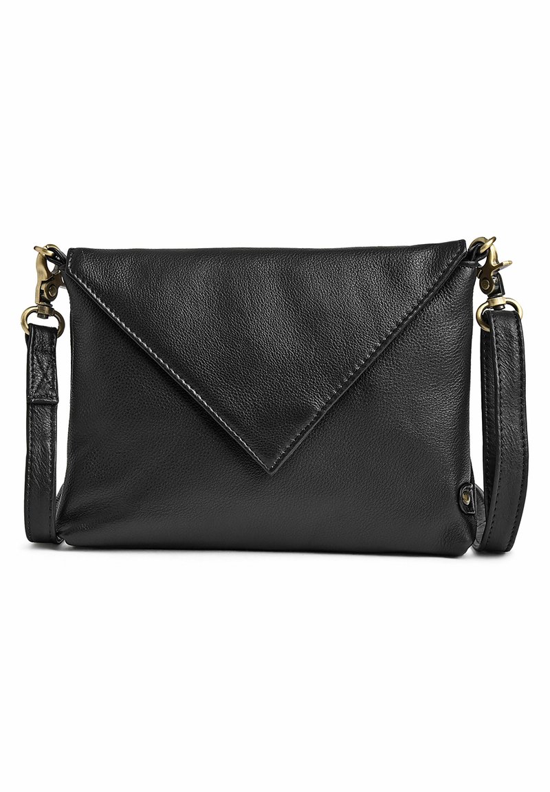 Černá kožená kabelka přes rameno ve stylu obálky s nastavitelným popruhem a zlatými kovovými sponami, zobrazena na bílém pozadí.