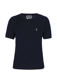 Žena s dlouhými blond vlasy nosící černý krátký svetr s malým bílým znakem kotvy, se založenýma rukama, na bílém pozadí.