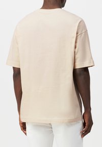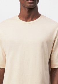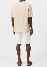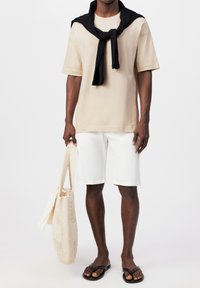 Muž ve světlém béžovém tričku s krátkým rukávem a bílých kalhotách, stojící před neutrálním šedým pozadím.