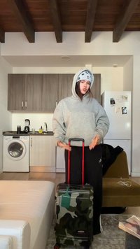 Černá kožená střihová bunda, volné modré džíny, růžové tenisky Converse a zelený maskáčový kufr na kolečkách s červenými prvky.