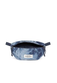 Modrý batoh s vázanou vazbou a černým zipem, vybavený dvojitými táhly, s logem Eastpak umístěným ve středu přední strany.