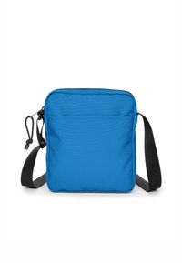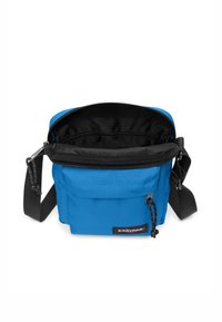 Modrá látková crossbody taška se zipovým uzávěrem, přední kapsou, nastavitelným černým popruhem a značkovou nášivkou na přední straně.