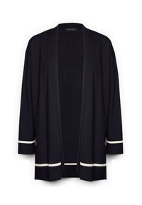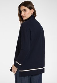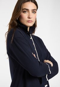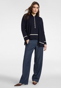 Žena v námořnicky modrém topu s dlouhým rukávem, perlovými knoflíky a bílým lemováním, v modrých džínách, s rukama v kapsách, dívá se stranou.
