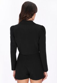 Žena s dlouhými vlnitými hnědými vlasy nosí černé krátké sako ve stylu šatů s kovovými knoflíky, velké náušnice a prsten, pózuje na bílém pozadí.